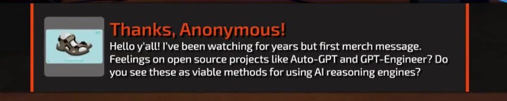 Thanks, Anonymous! Hello y'all! I've been watching for years but first merch message. Feelings on open source projects like Auto-GPT and GPT-Engineer? Do you see these as viable methods for using AI reasoning engines?