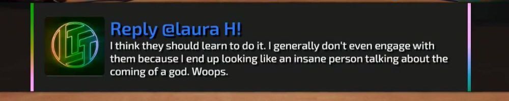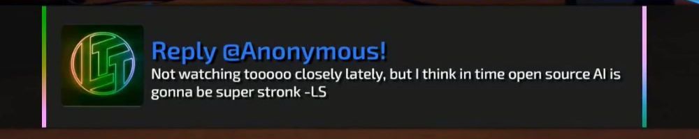 Reply @Anonymous! Not watching tooooo closely lately, but I think in time open source AI is gonna be super stronk -LS