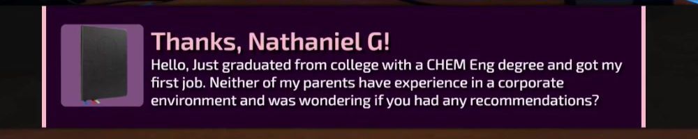 Thanks, Nathaniel G! Hello, Just graduated from college with a CHEM Eng degree and got my first job. Neither of my parents have experience in a corporate environment and was wondering if you had any recommendations?