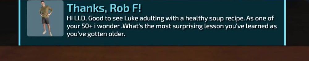 Thanks, Rob F! Hi LLD, Good to see Luke adulting with a healthy soup recipe. As one of your 50+ i wonder .What's the most surprising lesson you've learned as you've gotten older.