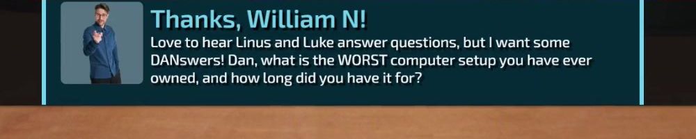 Thanks, William N! Love to hear Linus and Luke answer questions, but I want some DANswers! Dan, what is the WORST computer setup you have ever owned, and how long did you have it for?