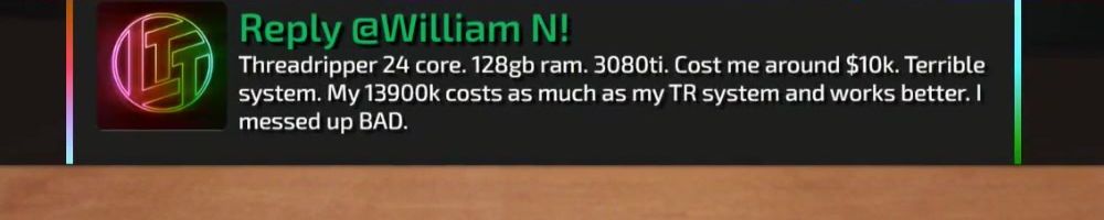 Reply @William N! Threadripper 24 core. 128gb ram. 3080ti. Cost me around $10k. Terrible system. My 13900k costs as much as my TR system and works better. I messed up BAD.