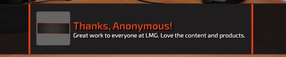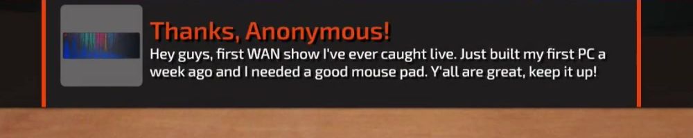 Thanks, Anonymous! Hey guys, first WAN show I've ever caught live. Just built my first PC a week ago and I needed a good mouse pad. Y'all are great, keep it up!