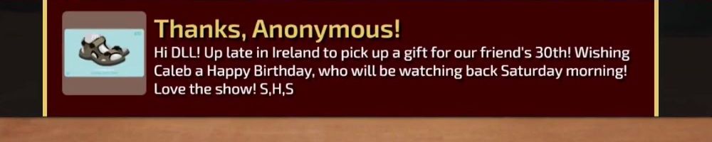 Thanks, Anonymous! Hi DLL! Up late in Ireland to pick up a gift for our friend's 30th! Wishing Caleb a Happy Birthday, who will be watching back Saturday morning! Love the show! SH,S
