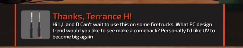 Thanks, Terrance H! Hi L.L and D Can't wait to use this on some firetrucks. What PC design trend would you like to see make a comeback? Personally I'd like UV to become big again