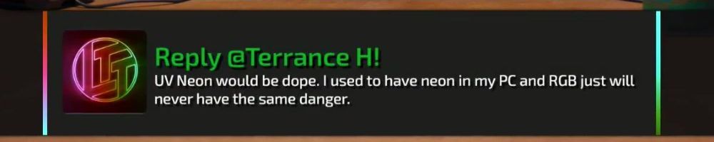 Reply @Terrance H! UV Neon would be dope. I used to have neon in my PC and RGB just will never have the same danger.