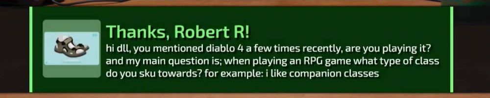 Thanks, Robert R! hi dl, you mentioned diablo 4 a few times recently, are you playing it? and my main question is; when playing an RPG game what type of class do you sku towards? for example: i like companion classes