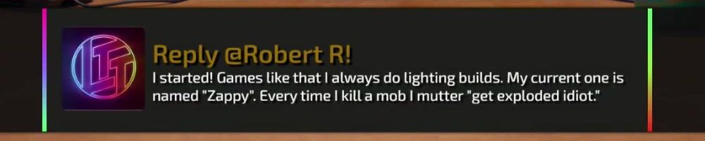 Reply @Robert R! I started! Games like that I always do lighting builds. My current one is named "Zappy". Every time I kill a mob I mutter "get exploded idiot."