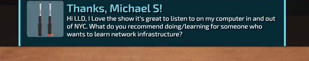 Thanks, Michael S! Hi LLD, I Love the show it's great to listen to on my computer in and out of NYC. What do you recommend doing/learning for someone who wants to learn network infrastructure?
