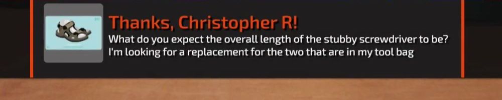 Thanks, Christopher R! What do you expect the overall length of the stubby screwdriver to be? I'm looking for a replacement for the two that are in my tool bag
