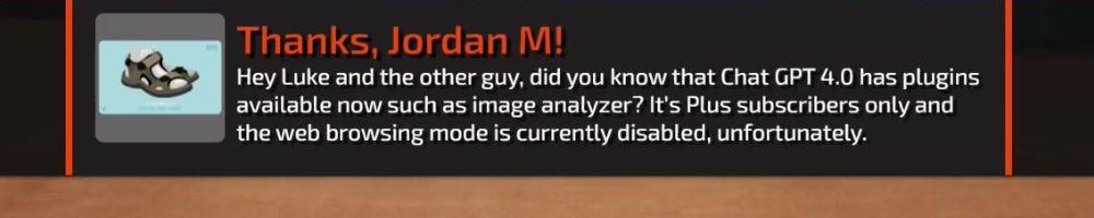 Thanks, Jordan M! Hey Luke and the other guy, did you know that Chat GPT 4.0 has plugins available now such as image analyzer? It's Plus subscribers only and the web browsing mode is currently disabled, unfortunately.