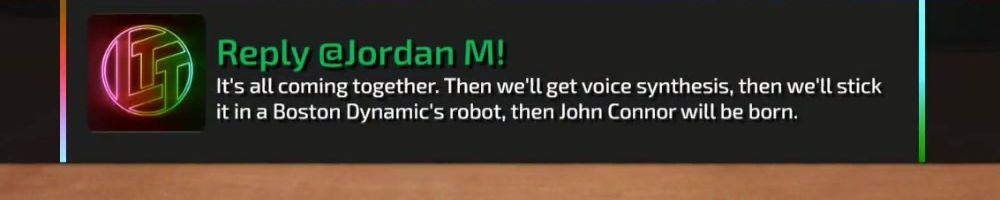 Reply @Jordan M! It's all coming together. Then we'll get voice synthesis, then we'll stick it in a Boston Dynamic's robot, then John Connor will be born.