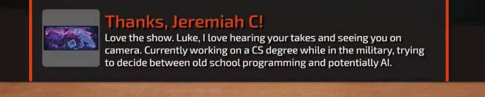 Thanks, Jeremiah C! Love the show. Luke, I love hearing your takes and seeing you on camera. Currently working on a CS degree while in the military, trying to decide between old school programming and potentially AI.