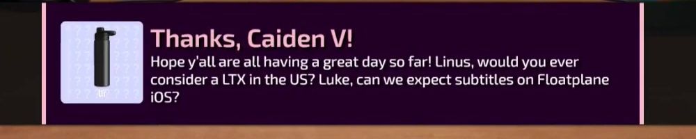 Thanks, Caiden V! Hope y'all are all having a great day so far! Linus, would you ever consider a LTX in the US? Luke, can we expect subtitles on Floatplane iOS?
