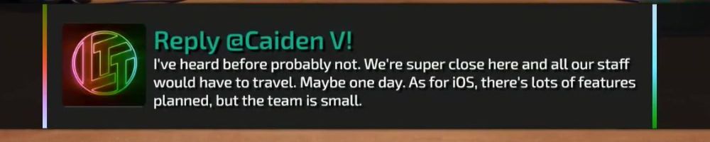 Reply @Caiden V! I've heard before probably not. We're super close here and all our staff would have to travel. Maybe one day. As for iOS, there's lots of features planned, but the team is small.