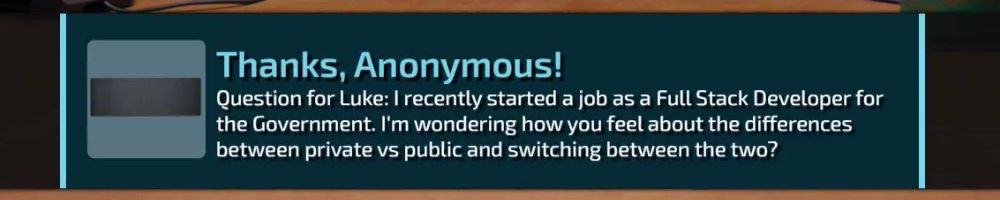 Thanks, Anonymous! Question for Luke: I recently started a job as a Full Stack Developer for the Government. I'm wondering how you feel about the differences between private vs public and switching between the two?