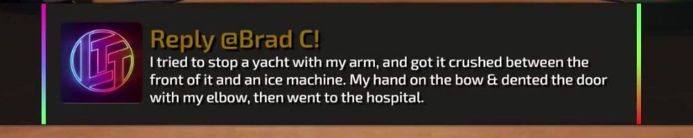 Reply @Brad C! I tried to stop a yacht with my arm, and got it crushed between the front of it and an ice machine. My hand on the bow & dented the door with my elbow, then went to the hospital.