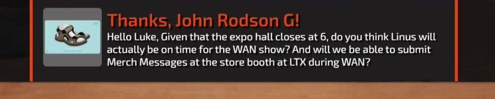 Hint: Use CTRL + F to search messages in this show, or use Whenplane's WAN Show Search tool to search for messages in all shows. Make sure that the "Merch Messages" box is checked when you search for something.