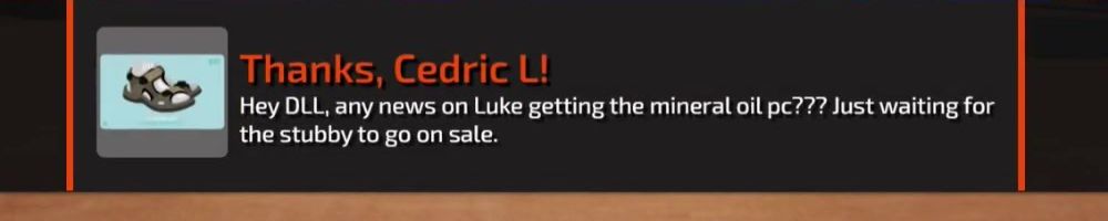 Thanks, Cedric L! Hey DLL, any news on Luke getting the mineral oil pc??? Just waiting for the stubby to go on sale.