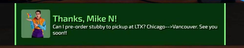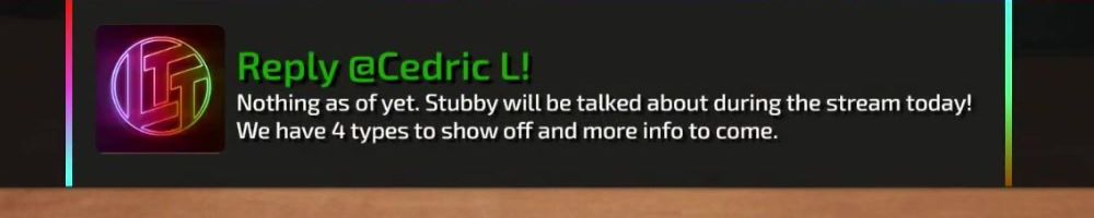 Reply @Cedric L! Nothing as of yet. Stubby will be talked about during the stream today! We have 4 types to show off and more info to come.