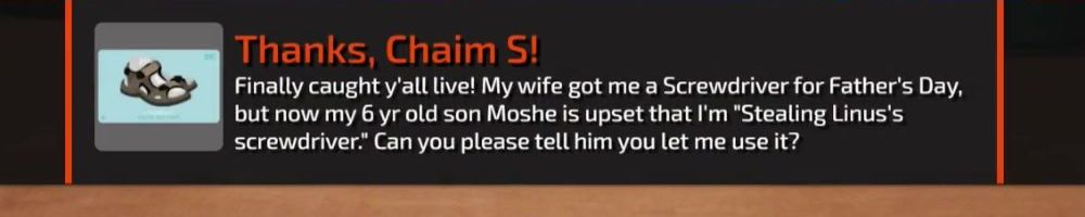 Thanks, Chaim S! Finally caught y'all live! My wife got me a Screwdriver for Father's Day, but now my 6 yr old son Moshe is upset that I'm "Stealing Linus's screwdriver.” Can you please tell him you let me use it?