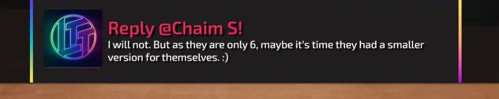 Reply @Chaim S! I will not. But as they are only 6, maybe it's time they had a smaller version for themselves. :)