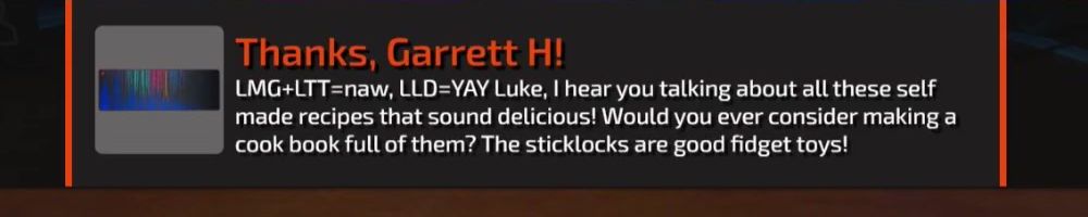 LMG+LTT=naw, LLD=YAY Luke, I hear you talking about all these self made recipes that sound delicious! Would you ever consider making a cook book full of them? The sticklocks are good fidget toys!
