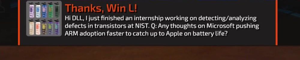 Hi DLL, I just finished an internship working on detecting/analyzing defects in transistors at NIST. Q: Any thoughts on Microsoft pushing ARM adoption faster to catch up to Apple on battery life?