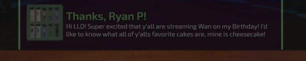 Hi LLD! Super excited that y'all are streaming Wan on my Birthday! I'd like to know what all of y'alls favorite cakes are, mine is cheesecake!
