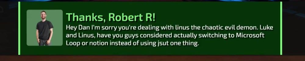 Hey Dan I'm sorry you're dealing with linus the chaotic evil demon. Luke and Linus, have you guys considered actually switching to Microsoft Loop or notion instead of using jsut one thing.