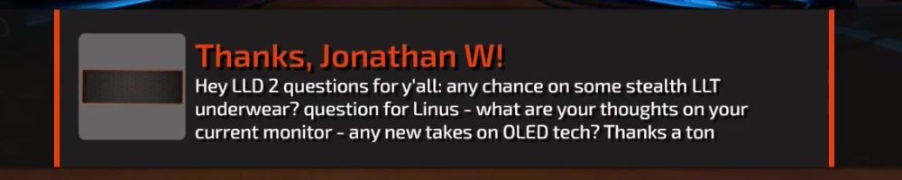 Hey LLD 2 questions for y'all: any chance on some stealth LLT underwear? question for Linus - what are your thoughts on your current monitor - any new takes on OLED tech? Thanks a ton