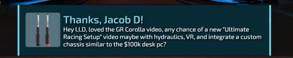 Hey LLD, loved the GR Corolla video, any chance of a new "Ultimate Racing Setup" video maybe with hydraulics, VR, and integrate a custom chassis similar to the $100k desk pc?