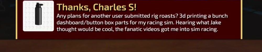 Any plans for another user submitted rig roasts? 3d printing a bunch dashboard/button box parts for my racing sim. Hearing what Jake thought would be cool, the fanatic videos got me into sim racing.