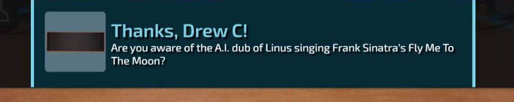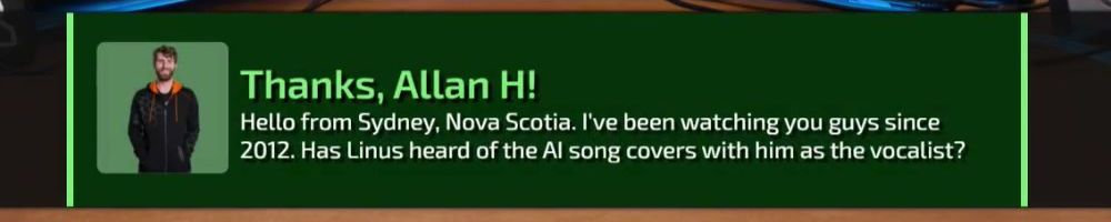 Hello from Sydney, Nova Scotia. I've been watching you guys since 2012. Has Linus heard of the AI song covers with him as the vocalist?
