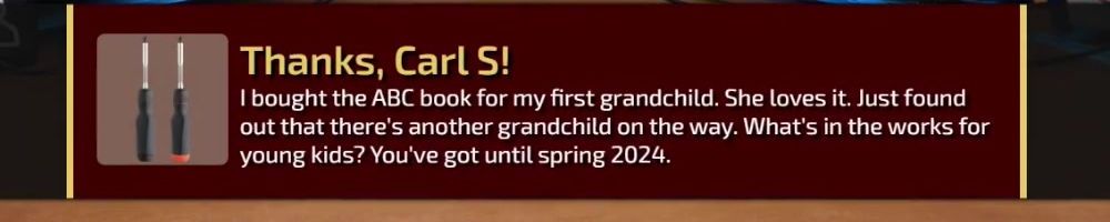 I bought the ABC book for my first grandchild. She loves it. Just found out that there's another grandchild on the way. What's in the works for young kids? You've got until spring 2024.