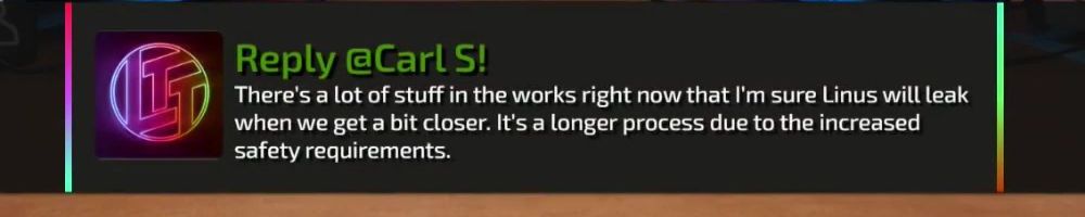 There's a lot of stuff in the works right now that I'm sure Linus will leak when we get a bit closer. It's a longer process due to the increased safety requirements.
