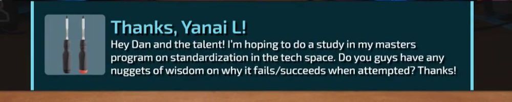 Hey Dan and the talent! I'm hoping to do a study in my masters program on standardization in the tech space. Do you guys have any nuggets of wisdom on why it fails/succeeds when attempted? Thanks!