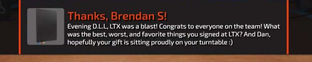 Evening D.L.L, LTX was a blast! Congrats to everyone on the team! What was the best, worst, and favorite things you signed at LTX? And Dan, hopefully your gift is sitting proudly on your turntable :)