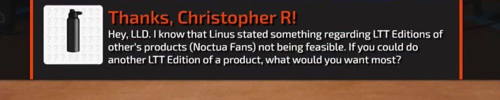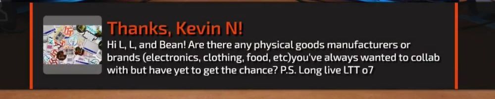 Hi L, L, and Bean! Are there any physical goods manufacturers or brands (electronics, clothing, food, etc) you've always wanted to collab with but have yet to get the chance? P.S. Long live LTT 07