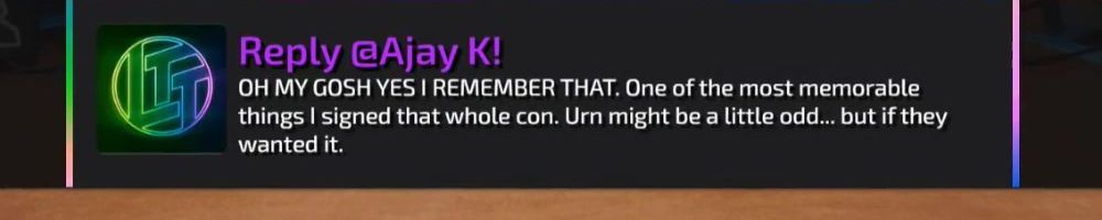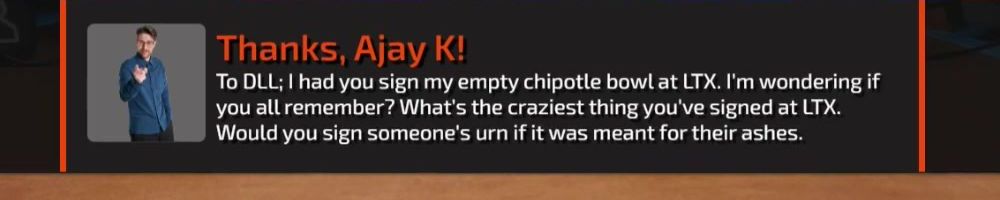 To DLL; I had you sign my empty chipotle bowl at LTX. I'm wondering if you all remember? What's the craziest thing you've signed at LTX. Would you sign someone's urn if it was meant for their ashes.