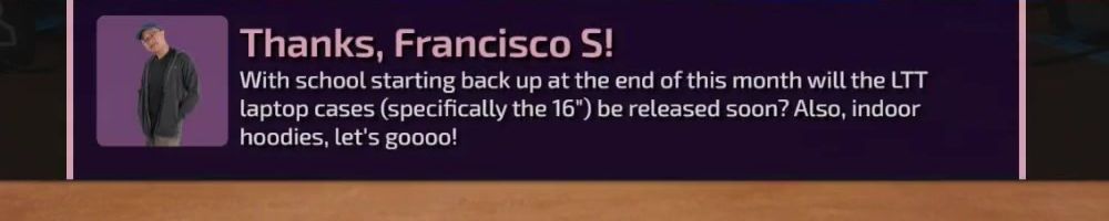 With school starting back up at the end of this month will the LTT laptop cases (specifically the 16") be released soon? Also, indoor hoodies, let's goooo!