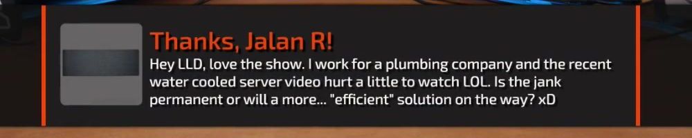 Hey LLD, love the show. I work for a plumbing company and the recent water cooled server video hurt a little to watch LOL. Is the jank permanent or will a more... "efficient" solution on the way? xD