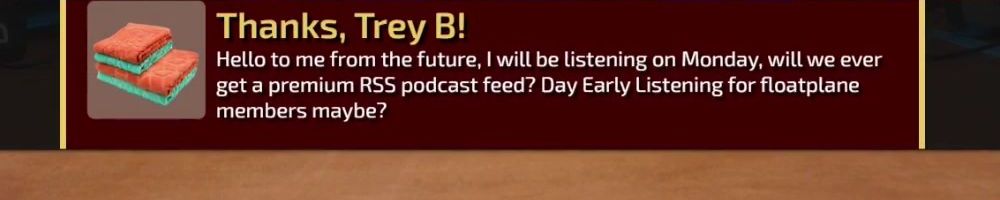 Hello to me from the future, I will be listening on Monday, will we ever get a premium RSS podcast feed? Day Early Listening for floatplane members maybe?