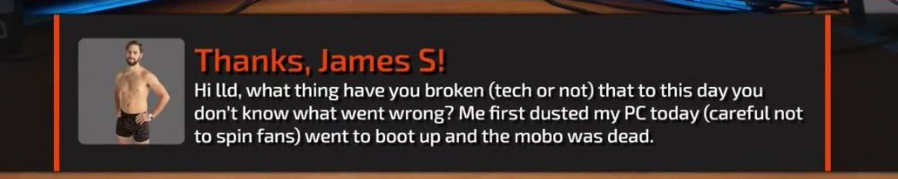 Hi lld, what thing have you broken (tech or not) that to this day you don't know what went wrong? Me first dusted my PC today (careful not to spin fans) went to boot up and the mobo was dead.