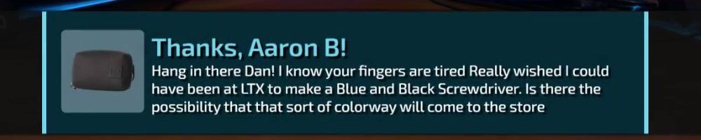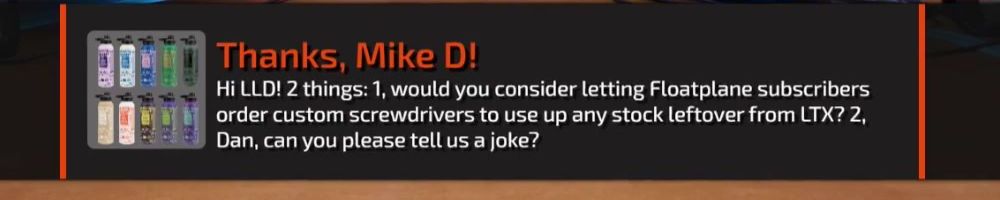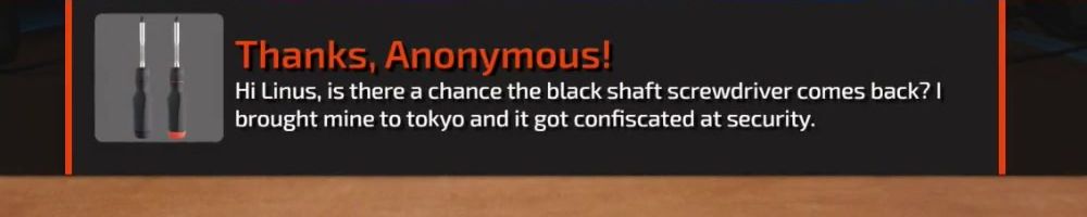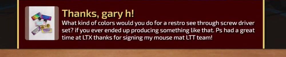 Thanks, gary h! What kind of colors would you do for a restro see through screw driver set? if you ever ended up producing something like that. Ps had a great time at LTX thanks for signing my mouse mat LTT team!