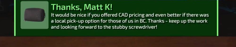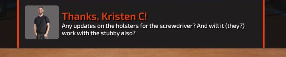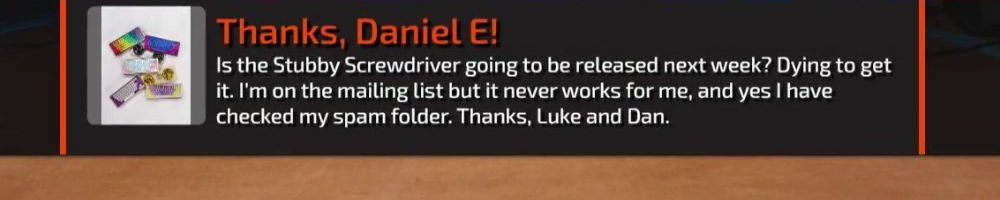 Thanks, Daniel E! Is the Stubby Screwdriver going to be released next week? Dying to get it. I'm on the mailing list but it never works for me, and yes I have checked my spam folder. Thanks, Luke and Dan.