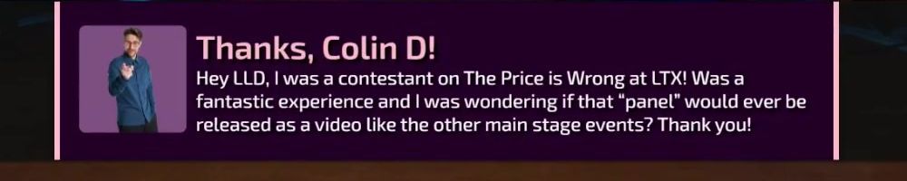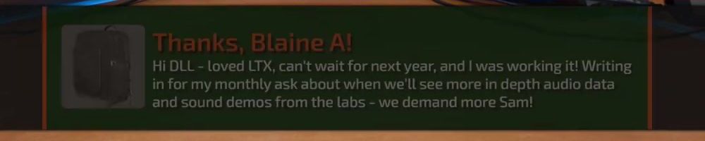 Thanks, Blaine A! Hi DLL - loved LTX, can't wait for next year, and I was working it! Writing in for my monthly ask about when we'll see more in depth audio data and sound demos from the labs - we demand more Sam!