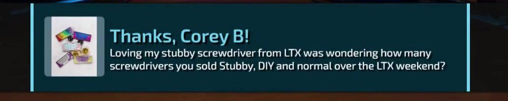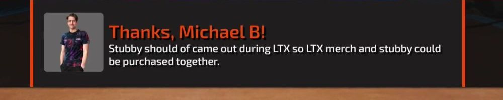 Thanks, Michael B! Stubby should of came out during LTX so LTX merch and stubby could be purchased together.