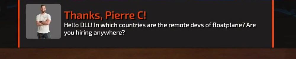 Thanks, Pierre C! Hello DLL! In which countries are the remote devs of floatplane? Are you hiring anywhere?