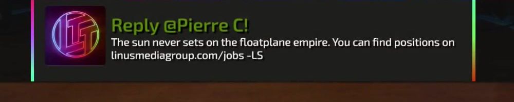 Reply @Pierre C! The sun never sets on the floatplane empire. You can find positions on linusmediagroup.com/jobs -LS